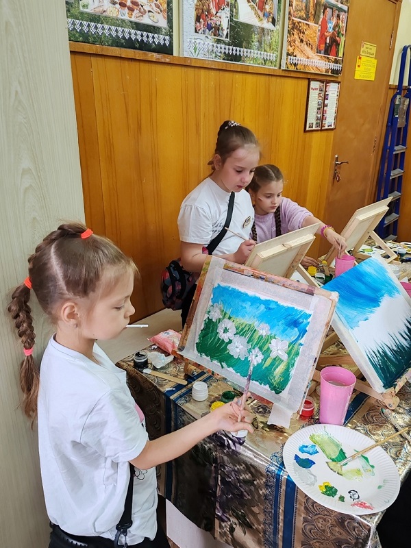 Под их чутким руководством дети создавали яркие открытки с использованием нетрадиционных способов рисования и живописные пейзажи с ромашковым полем – символом нашей Родины.