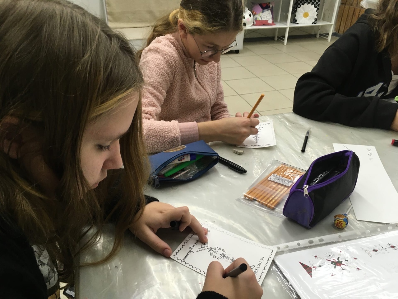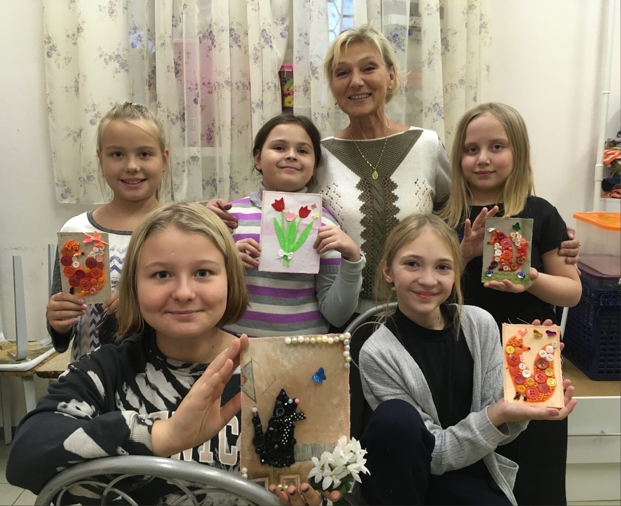 В классе лоскутного дизайна под руководством преподавателя С.В.Бобыренко девочки мастерили текстильные открытки. Юные рукодельницы использовали в работе разноцветные пуговицы, что придало каждой открытке неповторимость и творческую оригинальность.
