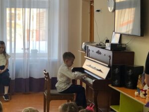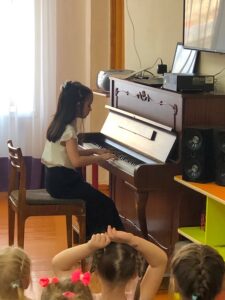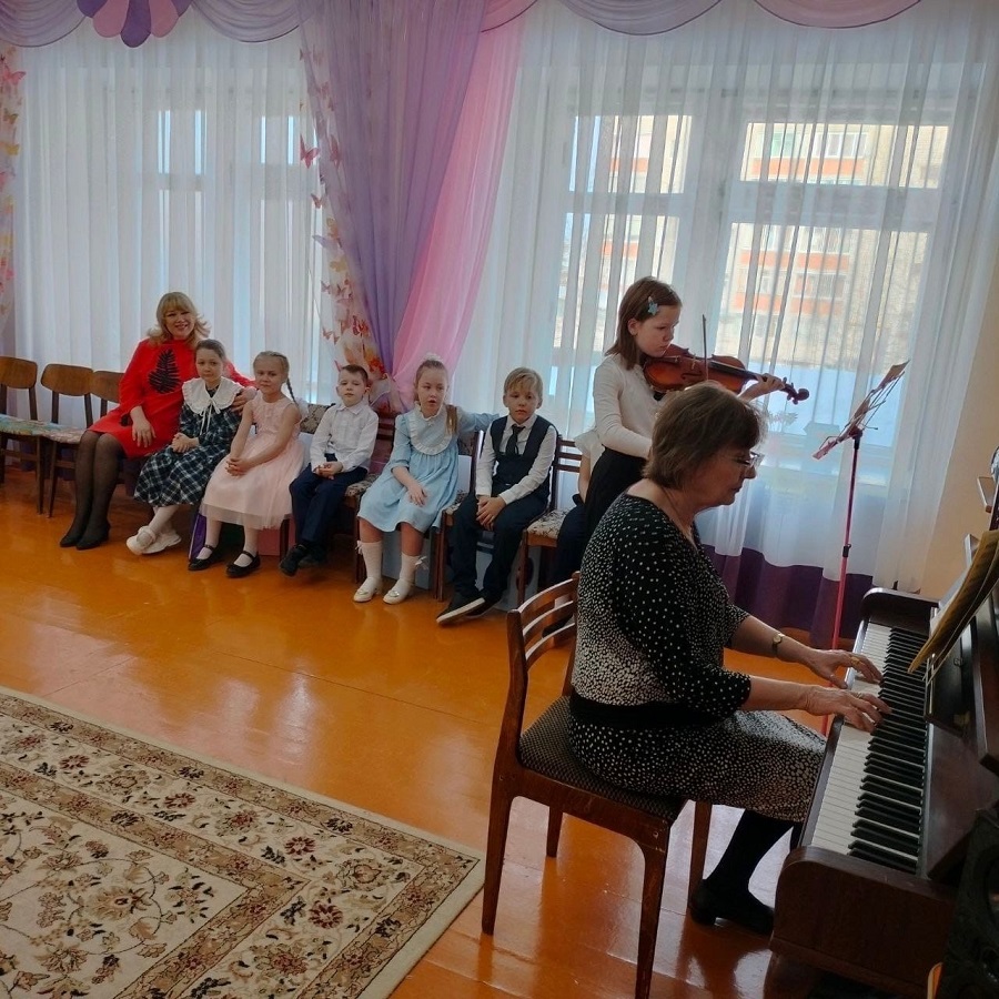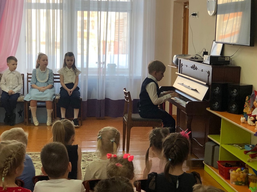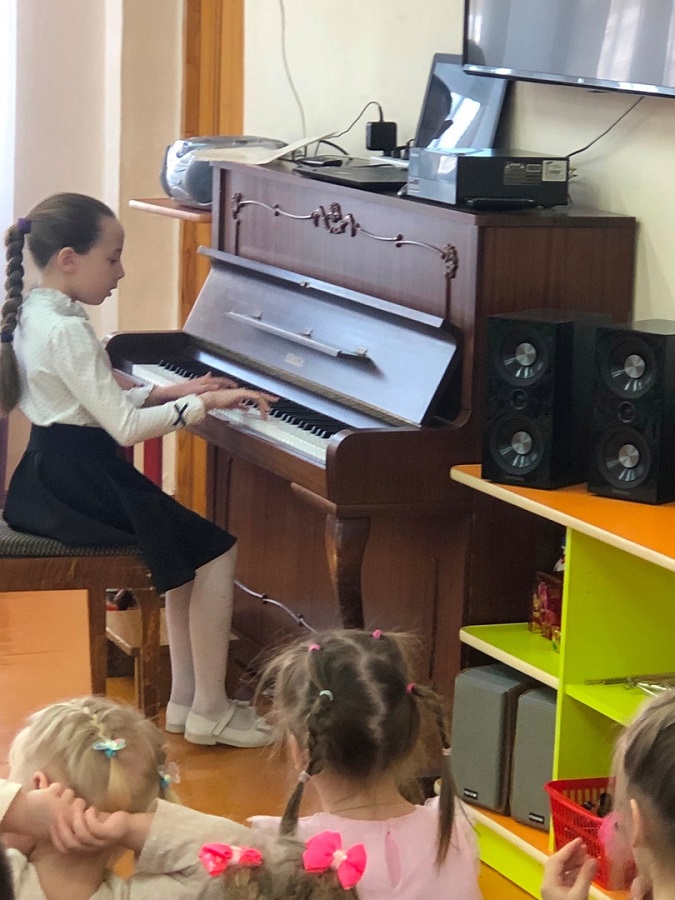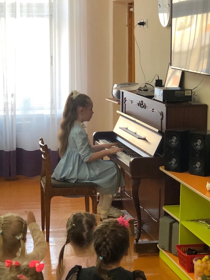 Преподаватель Анна Валентиновна Бурдельная очень интересно и доступно рассказала ребятам – дошколятам о Детской школе искусств. Затем перед ребятами выступили учащиеся школы: Кисельников Ростислав, Мосолова Ева, Наянзина Милана (преподаватель Бурдельная А. В.), Сергеева Дарья, Филимонова Диана, Пшеницына Виктория, Сметанин Максимилиан (преподаватель Богданова Н В), Ломакина София (преподаватель Шаверина Г Ю). В зале царила необычайно добрая и праздничная атмосфера. Маленькие слушатели с удовольствием погрузились в удивительный мир музыки. Все номера подбирались с учетом восприятия возраста дошкольников. Учащиеся нашей школы исполнили знакомые произведения, которые так вдохновенно и искренне звучали в живом исполнении. Каждому музыканту ребята дошкольники дарили бурные аплодисменты.