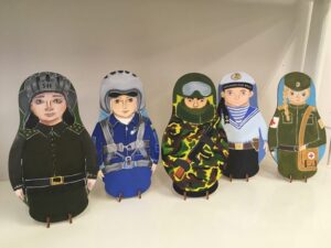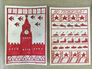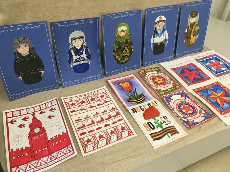 В небольшой экспозиции представлены открытки, коллективная работа “Герои Отечества”, а также эскизы, по которым создавался данный проект.
