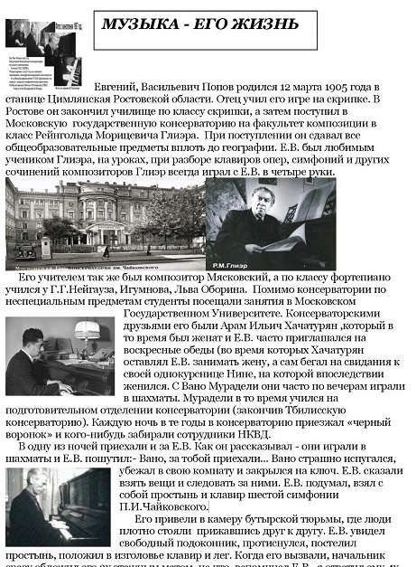 В годы репрессий, в одну из ночей в консерваторию по доносу приехали сотрудники НКВД. Е.В.Попов был арестован, осужден по статье «контрреволюционная деятельность» на 3 года и отправлен в Байкало-Амурский исправительно-трудовой лагерь.